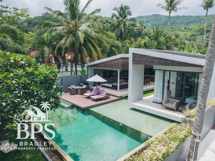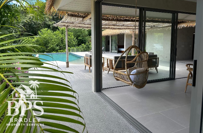 This modern 3bed/3-bathroom villa is located in the Bophut hills.